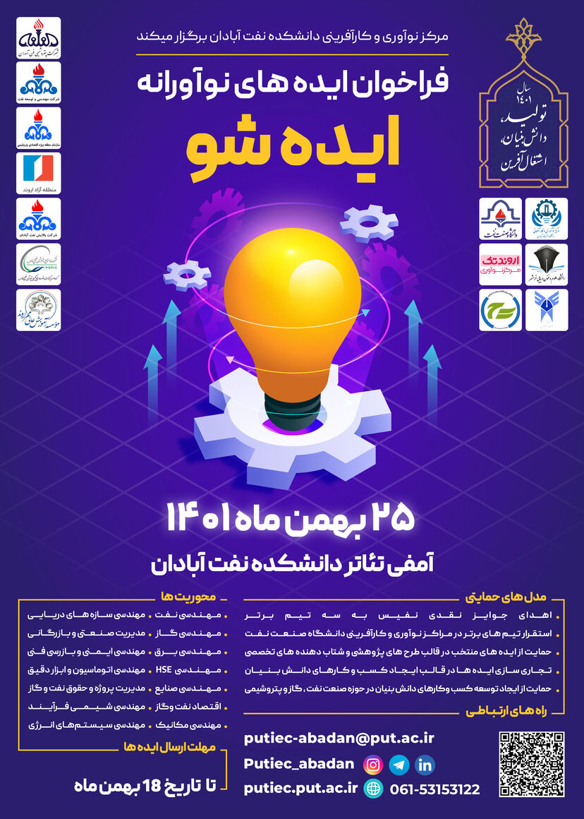 مهلت ارسال برای شرکت در این رویداد و ارائه ایده تا ۱۸ بهمنماه است، علاقهمندان میتوانند برای ارتباط با دبیرخانه رویداد به آدرس اینترنتی (https://putiec.put.ac.ir/fa-IR/put/7433) مراجعه یا با آدرس ایمیل مرکز نوآوری و کارآفرینی (putiec-abadan@put.ac.ir) برای ارسال ایده مکاتبه کنند.