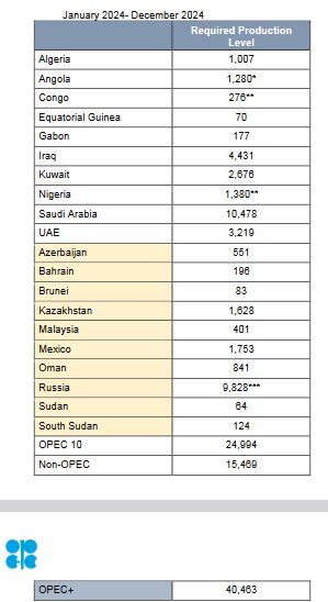 مقدار تولید کنگو و نیجریه ممکن است برای رسیدن به میانگین تولید مورد نظر در سال ۲۰۲۴ روزآمد شود، که این بروزرسانی بر اساس ارزیابی مؤسسههای «آیاچاس»، «وود مکنزی» و «ریستاد انرژی» در آخرین نشست اوپک در سال ۲۰۲۳ خواهد بود، برنامه تولید نیجریه برای سال ، یک میلیون و ۵۷۸ هزار بشکه در روز اعلام شده است که مشروط به تأیید سه منبع یادشده خواهد بود و در صورت تأیید، این رقم بهعنوان تولید مورد نیاز برای سال ۲۰۲۴ در نظر گرفته میشود.