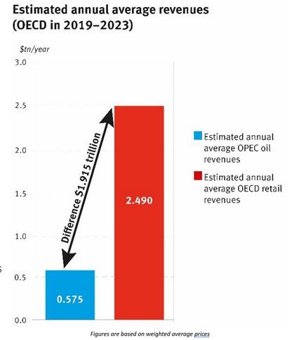 در بازه زمانی سالهای ۲۰۱۹ تا ۲۰۲۳، کشورهای عضو اویئیسیدی از محل خردهفروشی فرآوردههای نفتی (براساس میانگین وزنی قیمتها) بهطور میانگین سالانه حدود یکتریلیون و ۹۱۵ میلیارد دلار بیشتر نسبت به کشورهای عضو اوپک درآمدزایی کردند. مقدار قابل توجهی از قیمتهای نهایی خردهفروشی نهایی سوخت، به مالیات نسبت داده میشود.